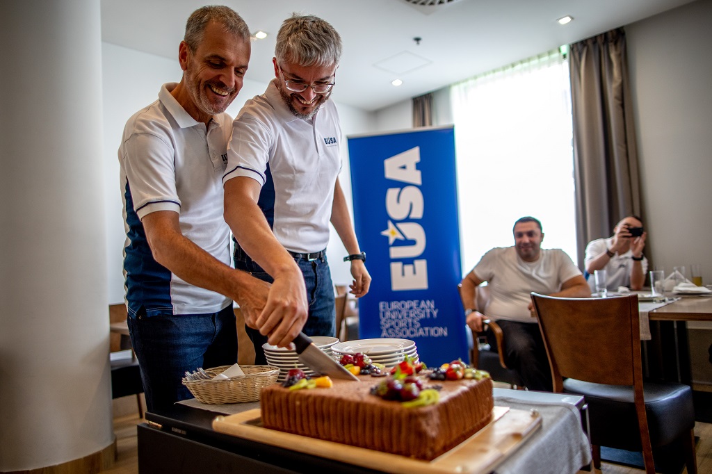 EUSA celebrated the occasion of the 10th Anniversary of the first European Universities Game today, with cake and short speeches given by the Secretary General of EUSA Mr Matjaž Pečovnik and 1st Vice-President of EUSA Mr Haris Pavletić.