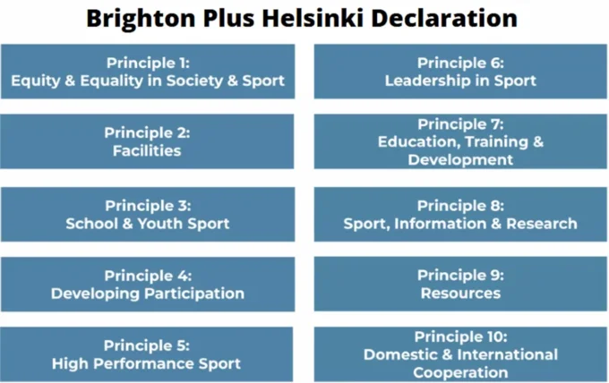 Developed and established by the International Working Group (IWG) Women & Sport in 1994, the Brighton Plus Helsinki Declaration is an international treaty that has become a roadmap for supporting the ongoing development of a fairer and more equitable system of sport and physical activity, fully inclusive of women and girls. It has been designed to complement all sporting, local, national, and international charters, laws, codes, rules, and regulations relating to equity in sport and physical activity, whilst also setting an even higher benchmark for the full inclusion of women and girls in all aspects of society.