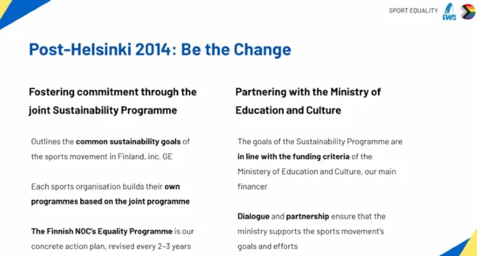 Kaisa Larjomaa, Public Affairs Manager at the Finnish Olympic Committee and member of the ENGSO EU Advisory Committee shared the insights from Finland and introduced long-term efforts of the Finnish NOC in improving gender equality at all levels.