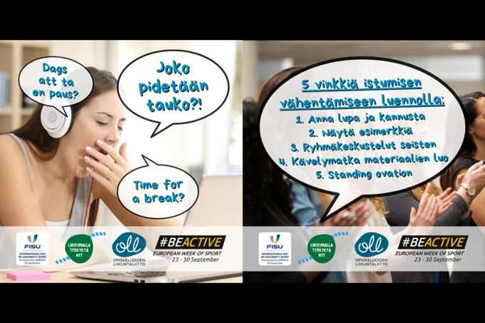 “The Time for a break?”. From September 20 to October 3 OLL raised awareness on the importance of reducing sitting in universities, especially during the lectures, giving facts and tips. Social media templates were provided to OLL members and university partners to ensure broad dissemination. This successful campaign also included an online panel discussion on how students would reduce sitting. OLL President Akseli Haanpää, National Union of Students in Finnish Universities of Applied Sciences – SAMOK President Julia Väänänen and National Union of University Students in Finland Vice President Tilda Lassila were discussing.