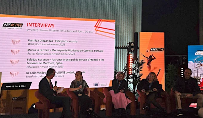 Following the awards ceremony, a panel debate in form of interviews with the 2023 #BeActive Awards winners was held, moderated by Georg Hausler, Director for Culture and Sport at DG EAC of the European Commission, with Vassiliya Draganova (AUT), Manuela Ferreira (POR), Soledad Rosende (ESP) and Kalin Vasilev (BUL) as the panellists.