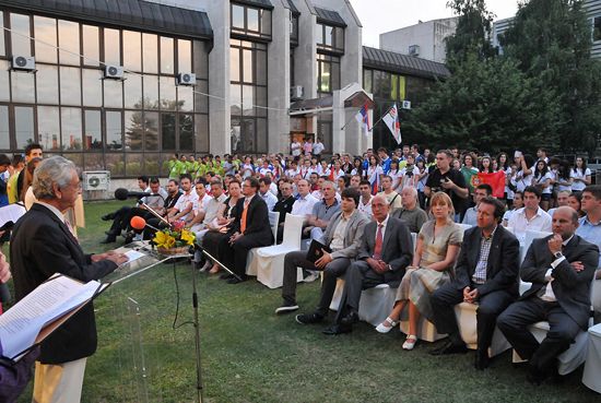 All of the participants – 9 women and 8 men’s team, together with the volunteers participated in this little introduction which lasted for about an hour. The Opening Ceremony was held in the courtyard of the University Rector Hall with important guests seated in the VIP lounge - for instance the Minister of Youth and Sports Mrs Snežana Samardžić-Marković and the Rector of the University of Kragujevac Mr Slobodan Arsenijević. Numerous members of the press were also present at the ceremony.