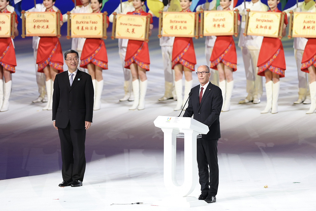 The ceremony included marchpass of the participants, greetings from Huai Jinpeng, president of the organising committee and FISU acting president Leonz Eder.