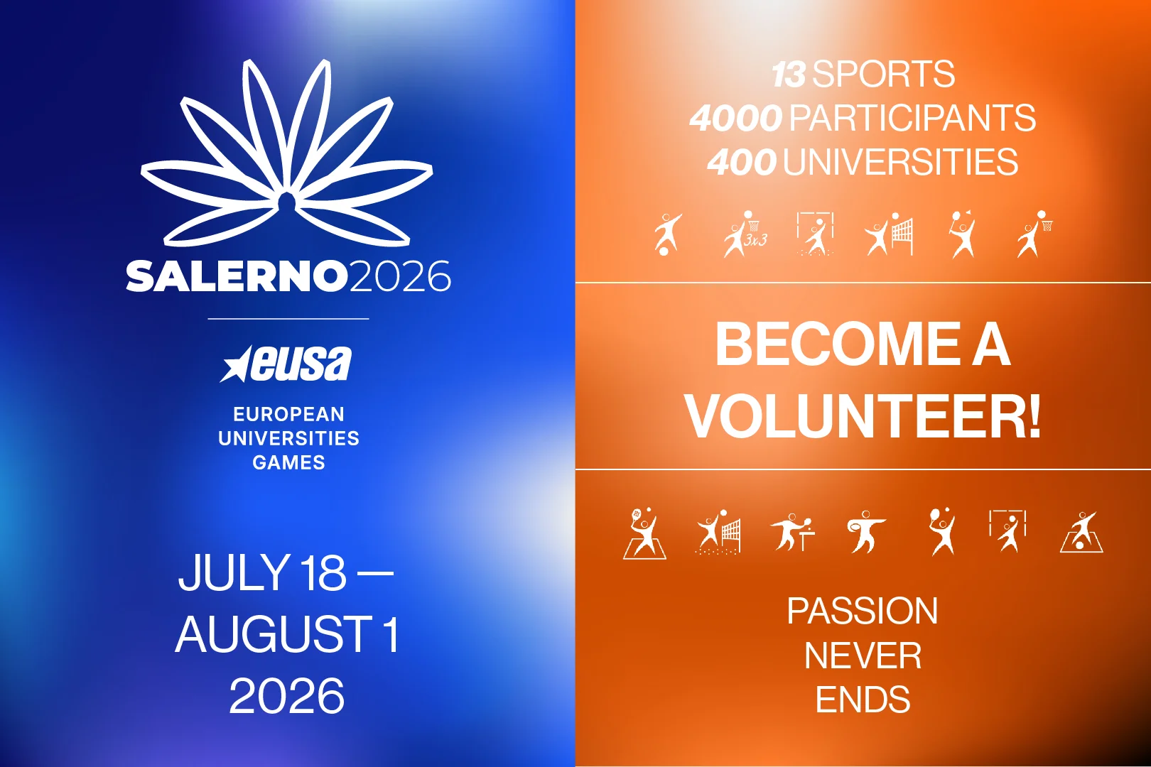 Register now for the 2026 European Universities Games in Salerno to join a vital volunteer team where you’ll gain hands-on leadership and organisational experience while helping drive the success of an unforgettable international sporting event. Discover all EUG 2026 volunteering opportunities here.
