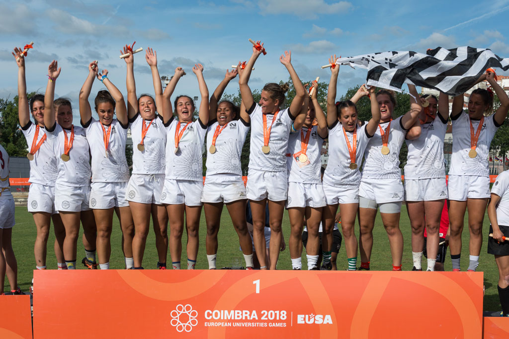 Ladies of University of Rennes 2 proved to be too strong for all of the opponents. When we say too strong, means that they were a class above all other teams in the competitions. They managed to win the gold medal without conceding a single point. Not by a single try or a drop goal from their opponents. They scored 46 points in average and convincingly won the gold. Silver went to University of Seville, while University of Coimbra won a bronze medal.
