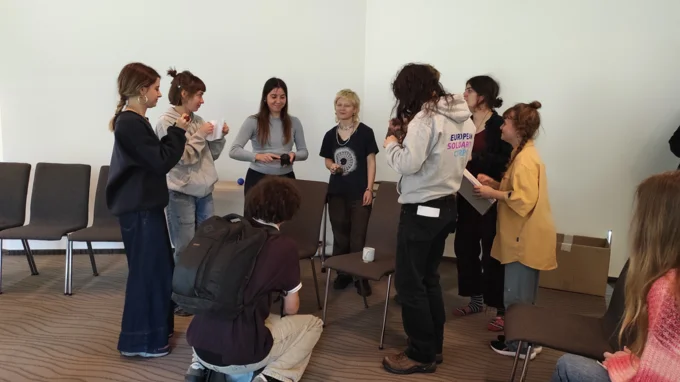 During this week, our ESC volunteers meet around 60 other volunteers, some having recently started their ESC project in Slovenia, some having already spent some months in the country and attending their Mid-Term Evaluation training in the same location. The training kicked off with team-building activities to encourage exchanges and facilitate the creation of bonds. In one of them, participants had to create a map of Slovenia using a rope and then position themselves on the map according to where they are volunteering; in another one, they were asked to line up according to their date of arrival in Slovenia, discovering with surprise that, besides someone that had been here for a couple of months, there were two volunteers just arrived in the country that same morning!