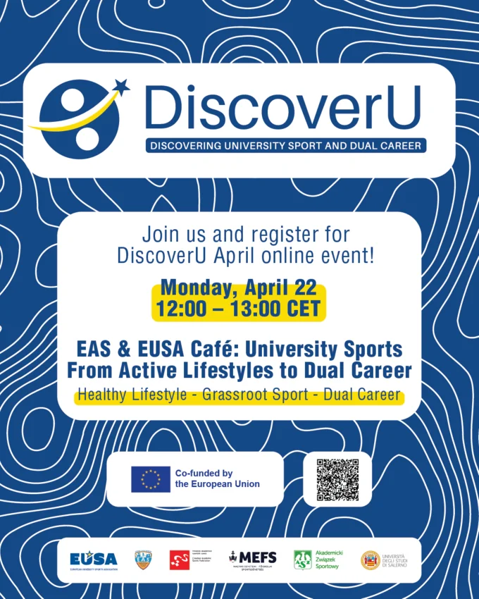 The second webinar will be organised within the activities of the DiscoverU project in a form of an online EAS & EUSA Café: University Sports - From Active Lifestyles to Dual Career. It will take place online on April 22nd from 12:00 – 13:00 CET.