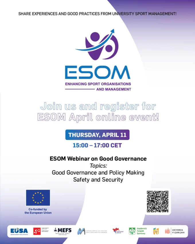 We are happy to invite you to two insightful webinars that will steal the spotlight in April: the ESOM Webinar on Good Governance and EAS & EUSA Café: University Sports - From Active Lifestyles to Dual Career.