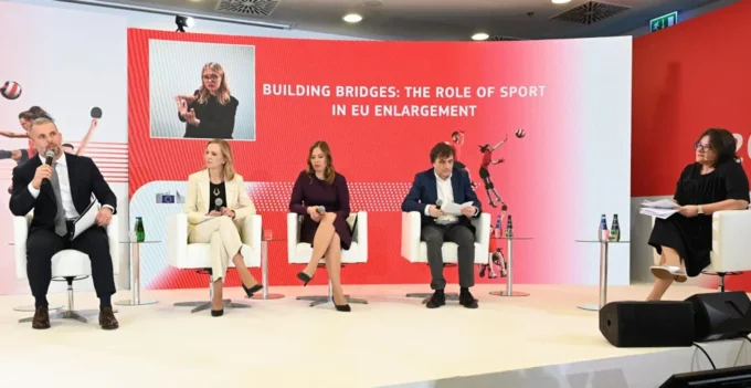 High-level panel on the second day focused on building bridges and the role of sport in EU enlargement. Moderated by Paola Ottonello, Team Leader at the Sport Unit of teh European Commission, the panellists were Matviy Bidnyi, Minister of Youth and Sports of Ukraine; Sandra Bergqvist, Minister of Youth, Sport and Physical Activity of Finland; Kersti Kaljulaid, President of the Estonian Olympic Committee; and Kurt Wachter, Project manager at VIDC.