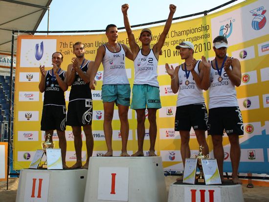 The women's medal ceremony was held by Director General of the Kazan 2013 Executive Board Mr Vladimir Leonov, EUSA CT Chair Mrs Daniela Erni and Russian representative on the FIVB Council Mr Ilya Volodarsky. Amid camera flashes and applause they presented three best women's tandems with the cups, medals and commemorative diplomas, with the Russian tandem of Victoria Rastykus/Daria Yarzutkina from the Moscow Institute of Business and Law topping the podium.