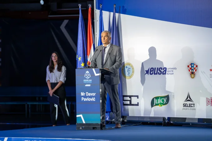 Warm welcomes have been addressed to the participants, inviting them to explore Zagreb while enjoying top-level competition, and highlighting national support for academic sport, including the invitation for the future EUG Split 2028.