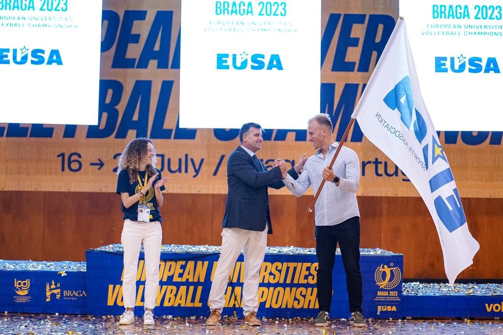At the end of the Closing Ceremony, the EUSA flag was passed to the next Organizing Committee, from Hungarian University of Sports Science, inviting all the teams to join the next European Universities Volleyball Championship in 2025, taking place in the city of Budapest from 4th July to 11th July.