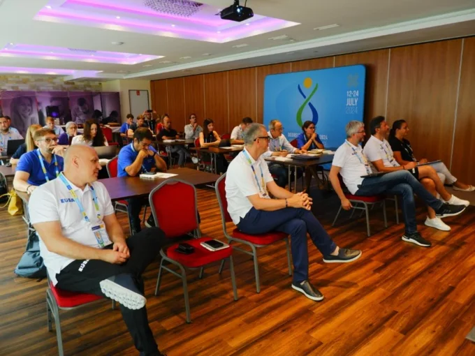 Representatives from the EUG2024 OC, Mr Laszlo Vegh, Mr Mate Nagyistok and Gyorgy Kovacs had a presentation illustrating some of the key aspects related to the experience of the process of organizing this year’s edition of the Games in Debrecen-Miskolc. They provided details related to the various roles and functional areas of the organization, the accreditation process, financial matters, transportation and accommodation issues, safety measures, as well as facilities and sports venue management.
