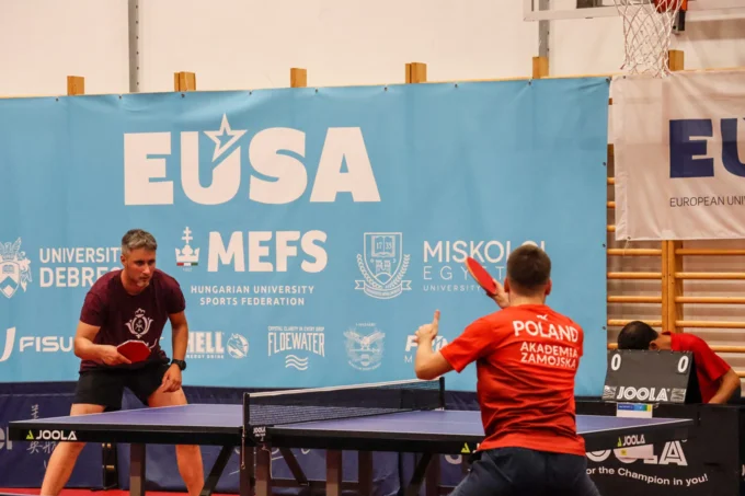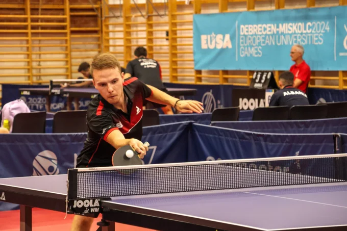 In the men’s competition, we witnessed the competitive spirit among the teams of University of Debrecen (HUN) playing against University of Ljubljana (SLO) ; Zamojski Academy (POL) vs Vytautas Magnus University (LTU), as well as Nisantasi University (TUR) against Swiss Federal Institute of Technology Lausanne (SUI). Fiery day at the Kossuth High School Hall in Debrecen today, as Table Tennis had a strong kick off at the European Universities Games 2024.