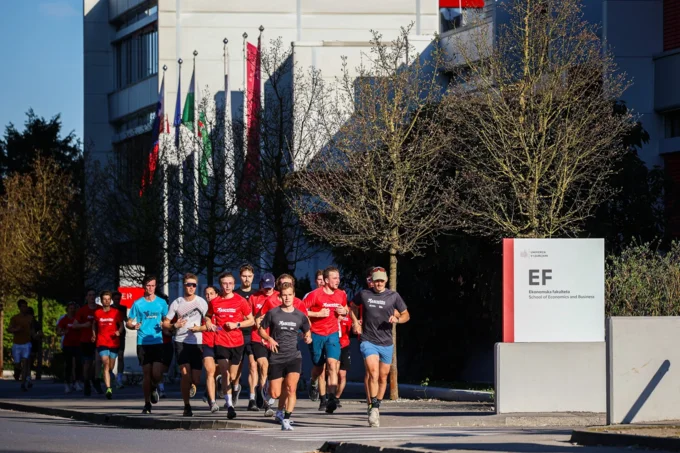 The Rozna Dolina Campus area was buzzing with energy, filled with music, cheering, and an enthusiastic crowd as runners were starting and finishing their distances. Over 900 participants ran together along one of three routes, either 5km, 10km, or 15km, passing by different university faculties and academies around the city. Participants ran in smaller groups led by other experienced students. Among the participants was also Gregor Madic, the Rector of the University of Ljubljana.