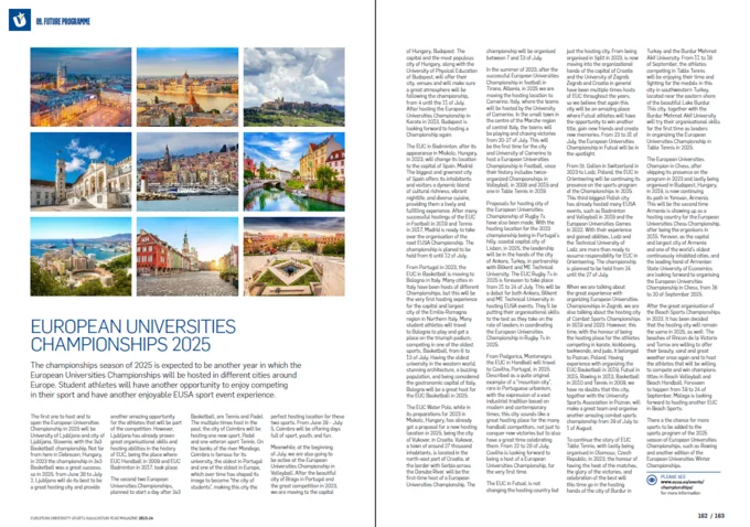 The last chapter is devoted to the future programme, where the readers will be able to read and stay tuned with the latest information about the European Universities Games in Debrecen – Miskolc, the European Universities Championships in 2025 as well as the European Universities Games in Salerno to be held in 2026.