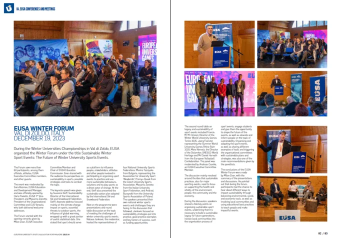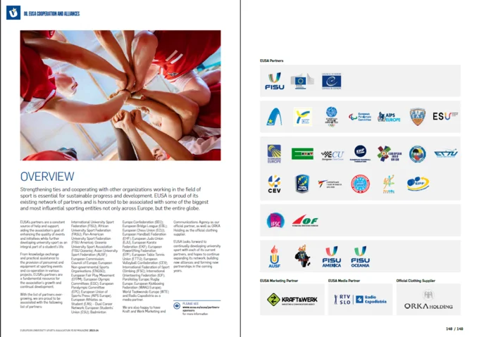 The magazine also offers an overview of the most visible events and achievements of the EUSA members and partners, including the International University Sports Federation (FISU), Continental university sports bodies of Africa, Americas, Asia and Oceania, as well as the other EUSA partners and allies, including the European Commission, Council of Europe, European Non-Governmental Sports Organisation (ENGSO) & ENGSO Youth, and the European Fair Play Movement (EFPM), European Athlete as Student (EAS) network and the European Handball Federation (EHF).