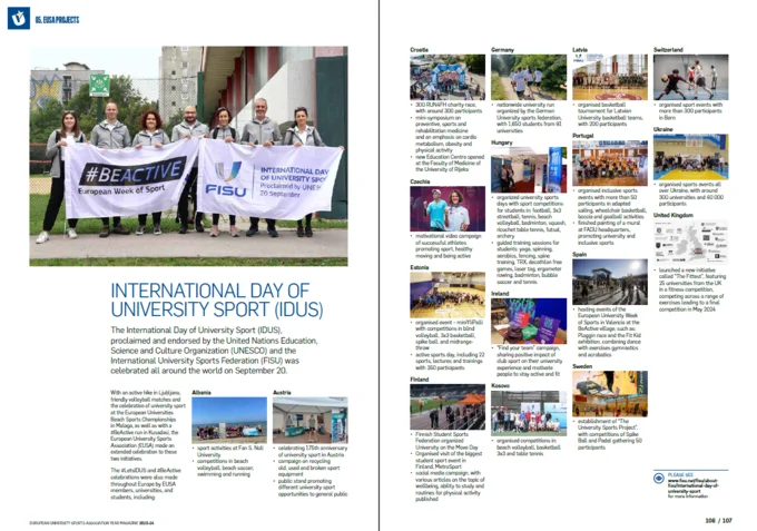 A chapter of the magazine is dedicated to EUSA’s numerous projects which showcase the association’s work in the topics of, among others, Equal Opportunities, Fair Play, and Dual Careers, while the EUSA Volunteer Programme, University Sport Exhibition, EUSA Club of Donors and the International Day of University Sport (IDUS) are also covered.
