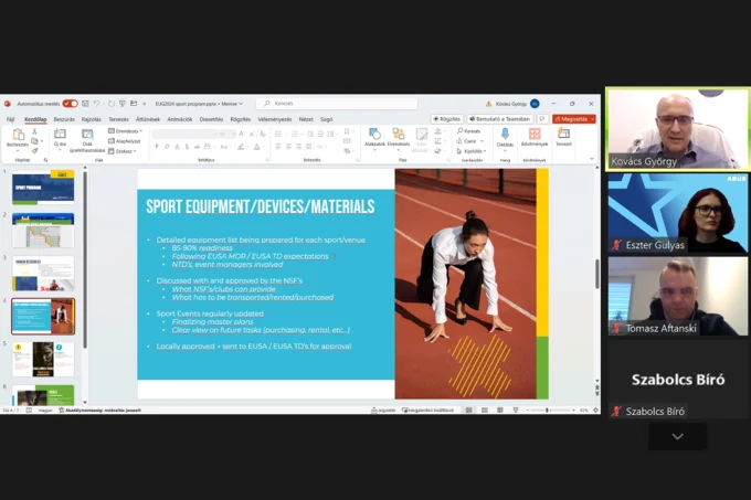 The meeting was attended by the EUSA Office Sports department (Miha Zvan, Eszter Gulyas and Aleksandra Andreeva), EUSA Technical Commission Executives, EUSA Technical Delegates and the EUG 2024 Organising Committee.