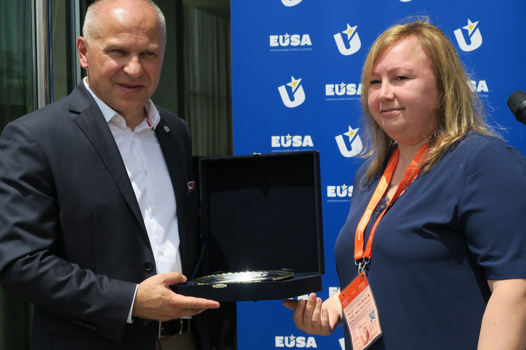 Representative of FISU Lilia Barieva in front of FISU gave the plaque to President of EUSA Mr Adam Roczek.