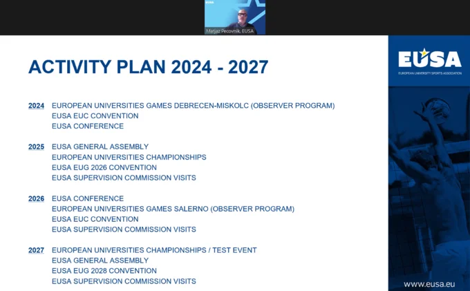 To conclude this webinar, EUSA Secretary General, presented the Activity plan for the next 4 years, giving a timeline of important EUSA events to be attended by the future attributed organiser, in order to get a better idea, knowledge and onsite examples of how to better organise the European Universities Games 2028.