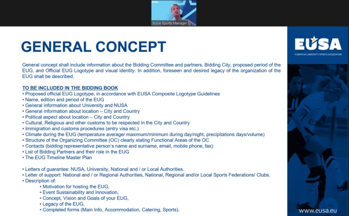 Information regarding the general concept of things to be included in the bidding book, the sports program, accommodation, transportation, medical services, and security services were given. Mr Zvan pointed out the sustainable approach and legacy intention behind the concept of EUSA events, as an important part to be considered while submitting and planning the bidding book.