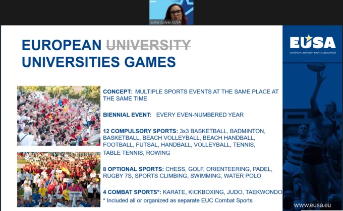 Ms Eszter Gulyas, EUSA Sports Officer then presented the philosophy and concept behind EUSA sports events, the timeline and growth of the sport program and numbers of the European Universities Games and Championships, as well as the importance of the legacy that these events leave behind.
