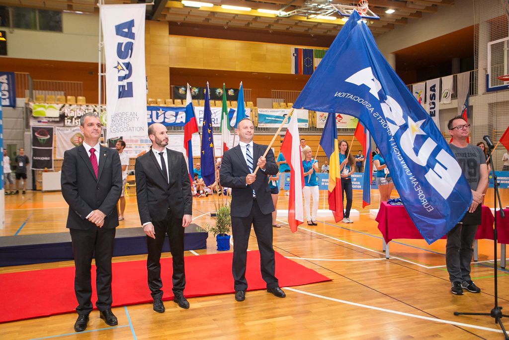 The EUSA flag was passed from hands of Mr Marko Juretic, President of the OC of the 13th European Universities Basketball Championship to Matjaz Pecovnik, EUSA Secretary General and forward to the next organizer of the Championship, dr. Csaba Deak, chancellor of the University of Miskolc.