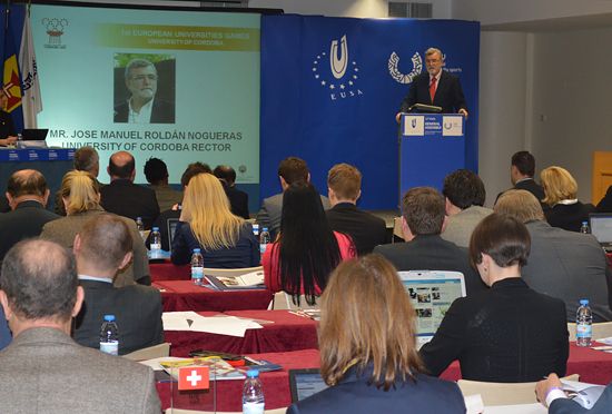The success of the sports events was explained in more details by EUSA Secretary General Mr Pecovnik, who presented some impressive facts and figures related to the 1st edition of the European Universities Games, held in Cordoba, Spain in 2012. For example, 2.574 participants competing in 252 university teams representing 154 universities from 32 countries were present in Cordoba. He also presented top teams by participation in terms of teams, universities and countries.