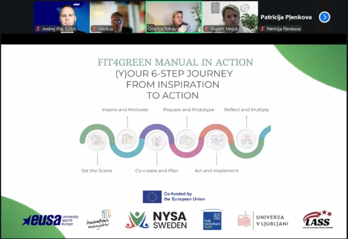 Fit4green is part of pilot projects and preparatory actions in the field of sport, led by the EUSA Institute (SLO), in partnership with Innovations Manufaktur (GER), Latvian University Sports Federation - LASS (LAT), University of Ljubljana (SLO), Holz Technicum Kuchl (AUT) and NYSA Sweden (SWE). The project is co-funded by the European Union. Views and opinions expressed are however those of the author(s) only and do not necessarily reflect those of the European Union or the European Education and Culture Executive Agency (EACEA). Neither the European Union nor EACEA can be held responsible for them.