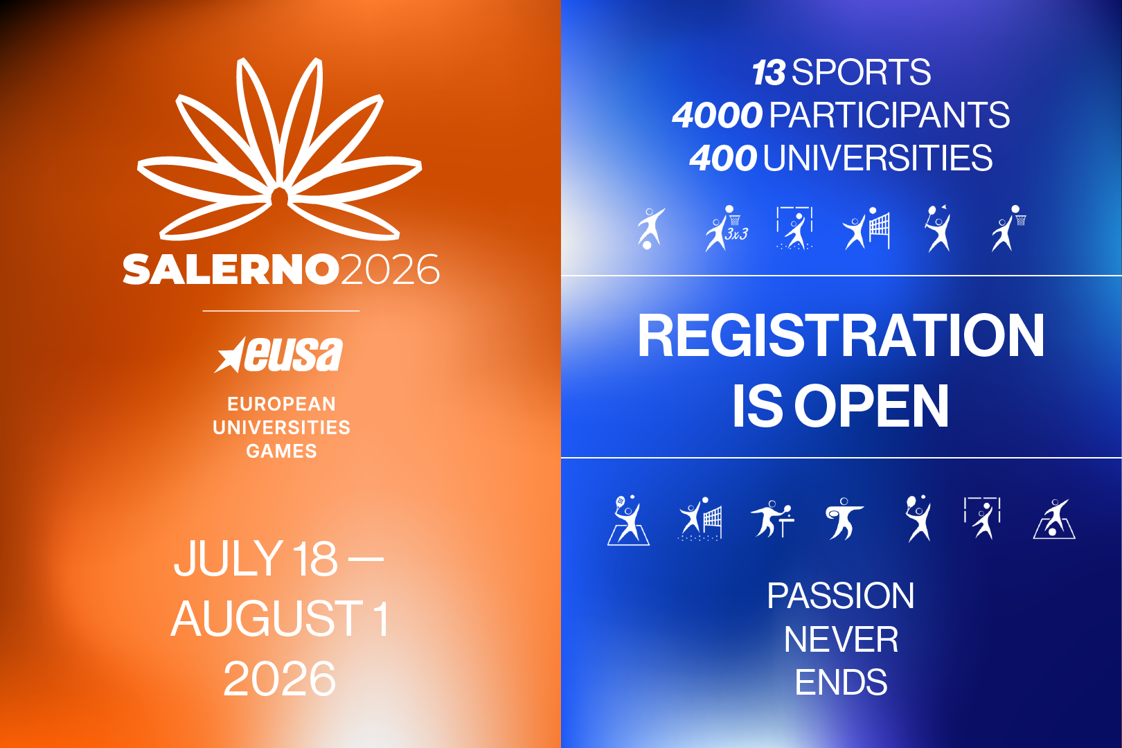 The European Universities Games will take place in Salerno, Italy, between July 18 and August 1, 2026. Salerno will become the beating heart of European university sports for these exciting days of the summer.