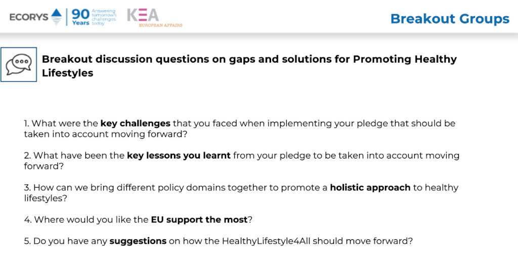 A workshop session in break-out groups followed, where participants in smaller groups were able to get to know each other a bit better, and then discuss what were the key challenges in implementation, what were the key lessons learnt, how can they bring together different policy domains together to promote a holistic approach to healthy lifestyles, where would they like the EU support the most, and share their suggestions on how the HealthyLifestyle4All should move forward.