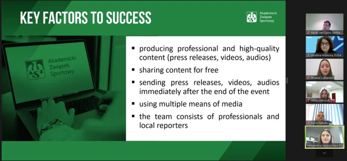 The third short workshop was done by Aleksandra Leszczynska from University Sports Association of Poland, focusing on Media and Communication in university sport, presenting the media and communication strategy of AZS, the benefits of the press office, website usage as a platform, social media, and the importance of cooperation with local media and media factors.