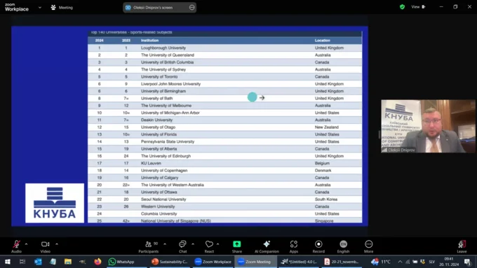 The international conference on Sustainability and Legacy in Sport: Challenges and Perspectives was held in Kyiv in hybrid format, hosted by the National University of Ukraine on Physical Education and Sport, Ministry of Education and Science of Ukraine, Ministry of Youth and Sport of Ukraine, National Academy of Educational Sciences of Ukraine, under the patronage of the European University Sports Association (EUSA), and the International Council of Sport Science and Physical Education (ICSSPE).
