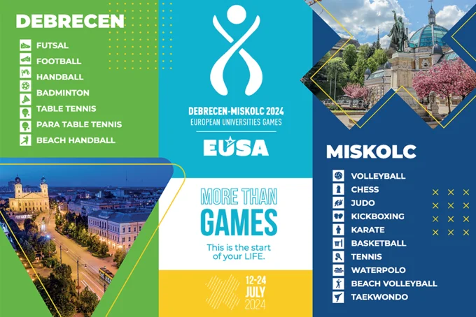 The European Universities Games Debrecen-Miskolc 2024 are organised by the Hungarian University Sports Federation (HUSF/MEFS) in cooperation with the European University Sports Association (EUSA) and its Institute, as well as cities, universities and university sport clubs in Debrecen and Miskolc. The event is co-funded by the European Union. For more information about the event and how to register, please visit www.eug2024.eu.