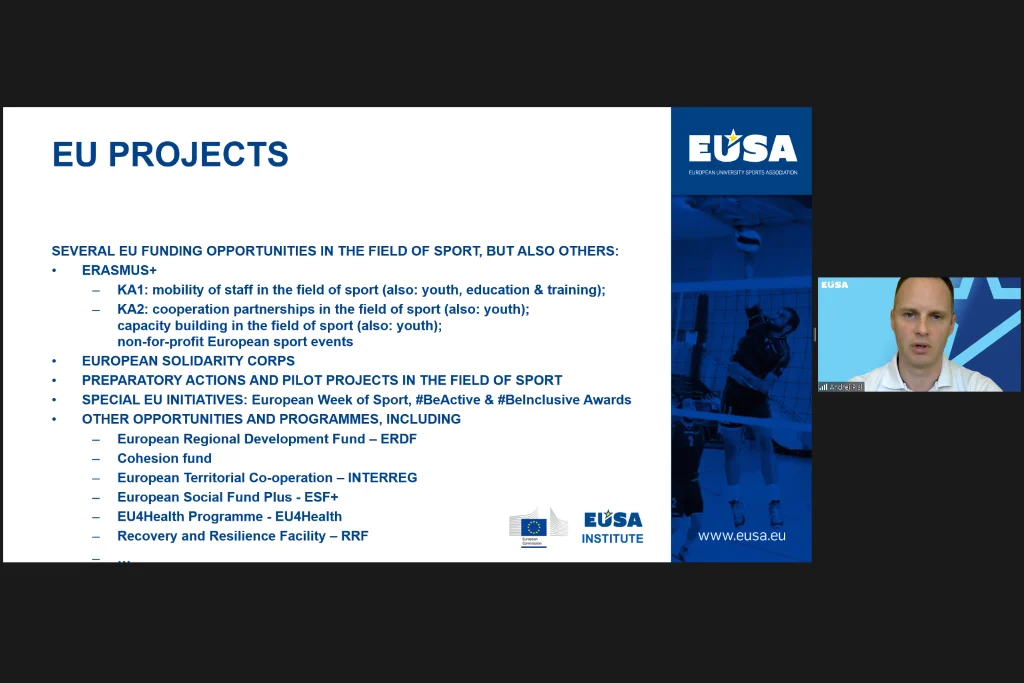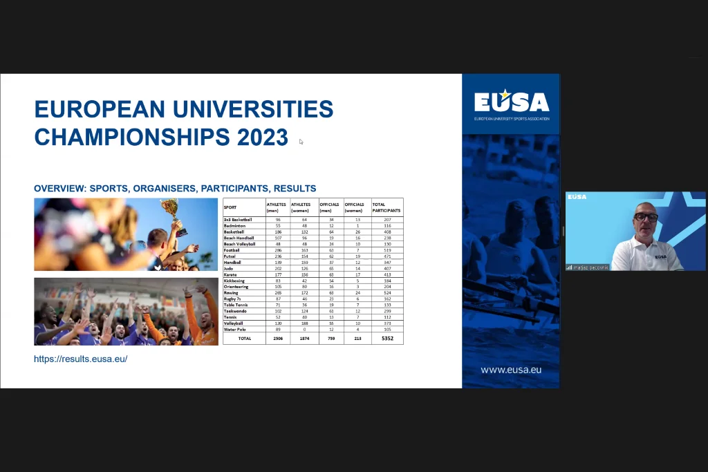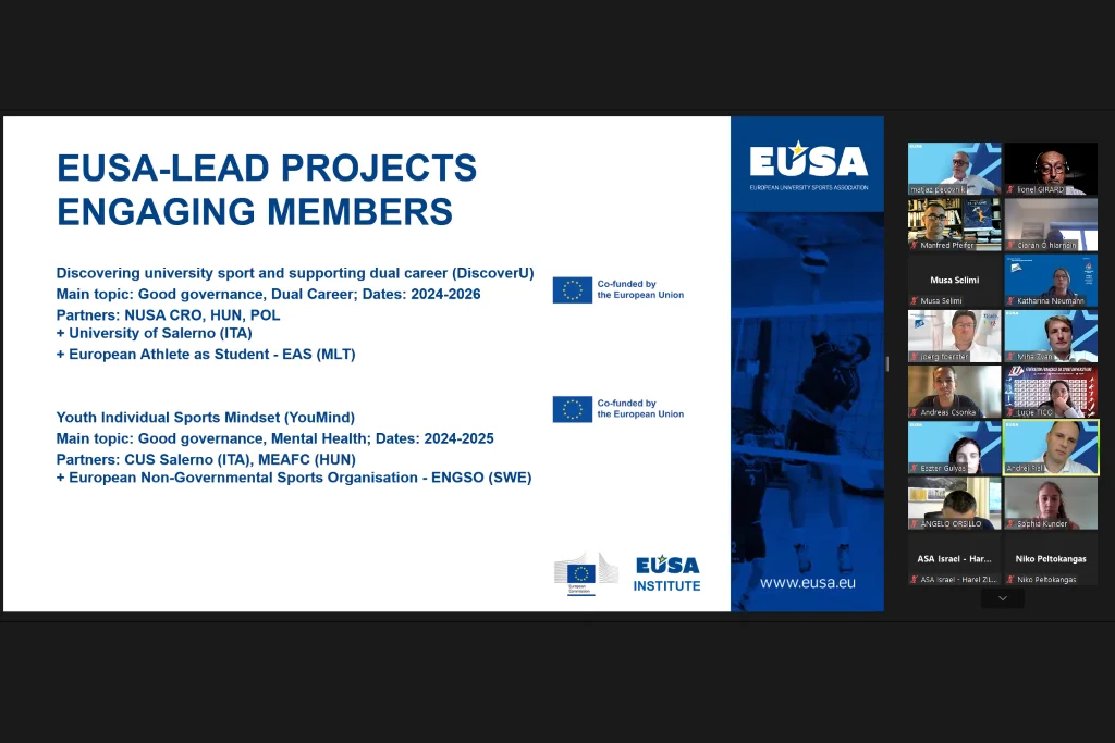 Finally, an update was given regarding other EUSA-lead EU-supported projects, engaging members and partners all over the continent. New projects, co-funded by the European Union, which are about to start, are the cooperation partnetship Discovering university sport and supporting dual career (DiscoverU), enhancing sport and physical activity opportunities for students in higher education and increasing their participation in these activities; and small partnership Youth individual sports mindset (YouMind), focusing on mental health of young athletes. A closer look was also goven to future projects and funding initiatives that EUSA is interested in actively participating in.![]()