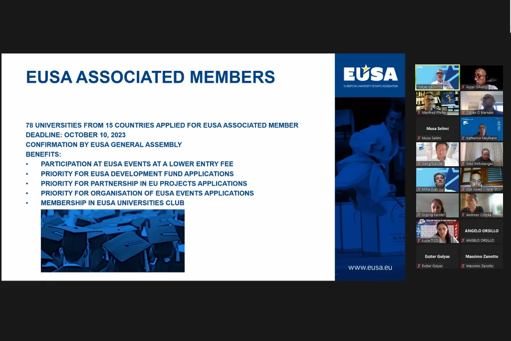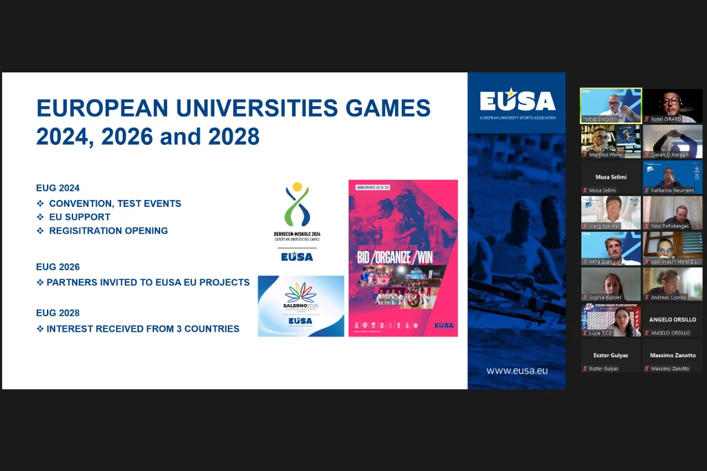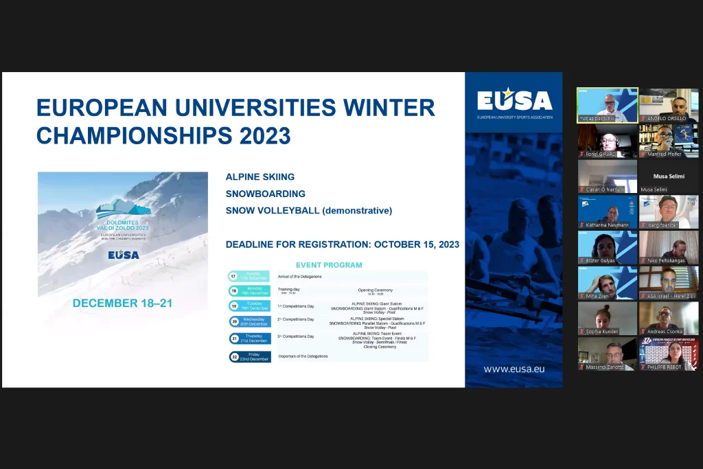 Ahead of the upcoming in-person meeting and October events in Kusadasi - EUSA General Assembly, EUSA-FISU Strategic Dialogue and EUSA Awards Gala, the agenda covered numerous topics, namely European Universities Championships (EUC), European Universities Games (EUG), the upcoming General Assembly, EUSA Anniversary and Conference, EUSA Associated Members and EU Projects.![]()