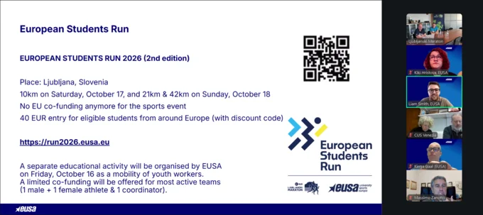 Details about the event taking place in Ljubljana in October 2026, with races scheduled for October 17 (10 km) and October 18 (21 km and 42 km), were given by EUSA Director Sports Events, Liam Smith. Registration is currently open, with a deadline set for September 15. Student discount codes are available for legible participants at https://run2026.eusa.eu.