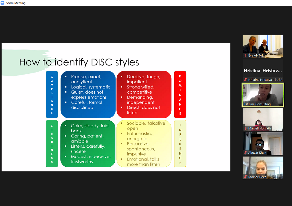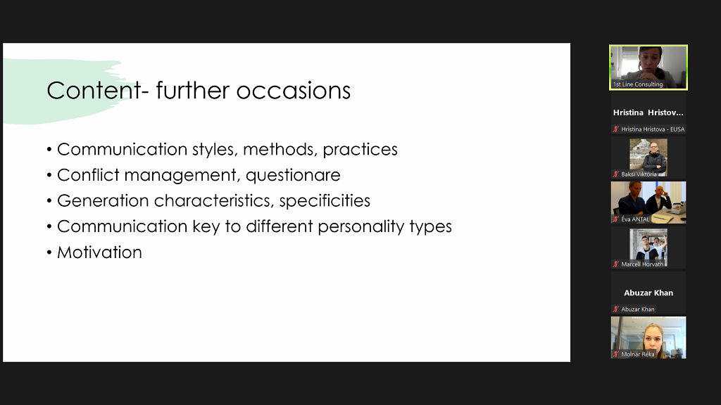 A 16-hour Effective customer service communication training course, accredited in the Hungarian adult education system took place online between October 21 and December 2. This training was conducted in English, having the participants meeting online through 5 sessions of the training. Six volunteers accepted the opportunity, so the training group of 10 people was filled with the future volunteer coordinators of the partner organizations. In this training EUSA was represented by Ms Hristina Hristova, EUSA Communication Officer.