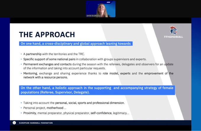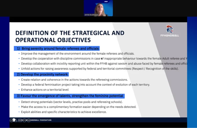 The session continued with Jamila Boulhimsse from the Female Officials Department within the Refereeing Committee of the French Handball Federation and EHF Delegate. She reflected on the female referees, focusing on the French Handball Federation’s approach. FHF works successfully toward parity and balance in refereeing, by mentoring, fostering partnerships and implementing various programs such as the Feminisation Plan, that aims to promote the development of women referees.