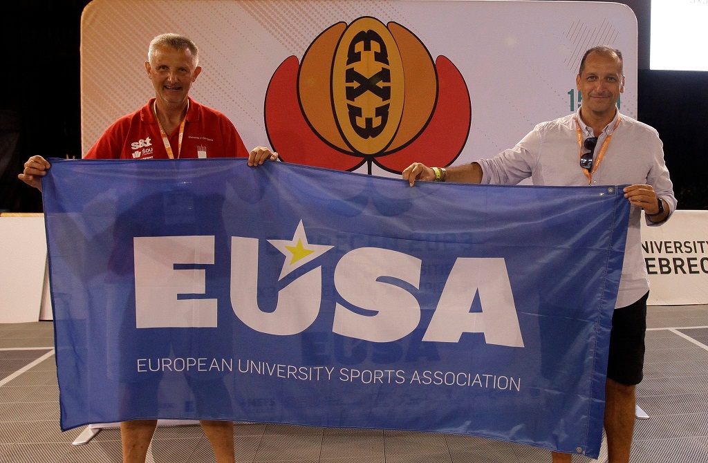 At the closing ceremony on Wednesday evening, the representative of the European University Sports Association (EUSA), Mr Ilan Kowalsky, presented a commemorative plaque for the great organisation to event coordinator Ms Kata Varga and Mr Károly Pető, Vice-Rector of the University of Debrecen.
