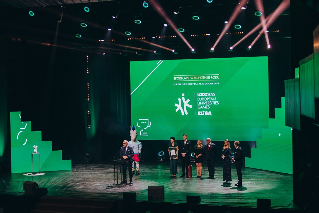 Another special award – “Sport event of 2022” has been European Universities Games in Lodz. Special recognition has been accepted by the Rector of Technology University of Lodz – Krzysztof Jóźwik, Coordinator of the event Dominik Leżański, TUL’s Sport Center’s Director Ewa Brochocka and University Sport Association representatives – Dariusz Piekut, Secretary General and Marianna Pikul, Volunteers Coordinator at EUG. The group has been joined by EUGenio – the event’s mascot.